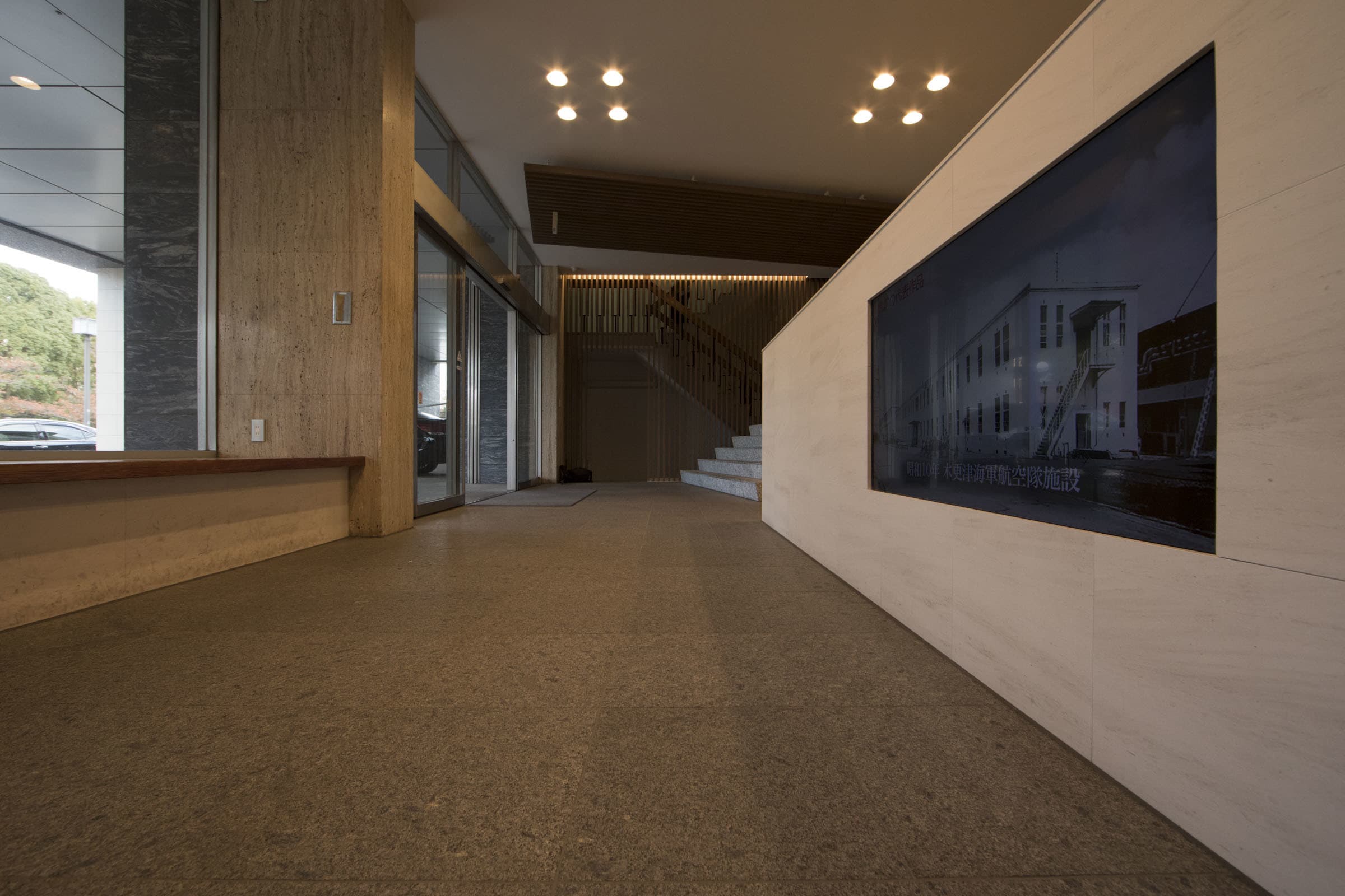 本社の耐震改修に合わせて行ったエントランスの改修工事です。外観については、耐震補強によってエントランス前の柱サイズが部分的に大きくなることがわかっており、それをデザインに積極的に取り込み2つの門型のフレームが重なりあった形として、来訪者を招き入れるゲートとなるようイメージしました。エントランス内部はルーバーを天井から正面の壁におろし来訪者の動線を示しつつ、その先の階段をルーバーで覆って間接照明で演出しました。新たに設置したスロープ部分は、新設したスロープの手摺壁と、あえて残した既存トラバーチン壁面とで新旧を融合させる空間としました。来訪者がベンチに気軽に腰を掛けながら、当社の歴史を知っていただく為に壁面埋めこみのデジタルサイネージを設置しました。当社のこれまでの歴史を重んじながらも、さらに発展していきたい、という願いを込めて取り組みました。